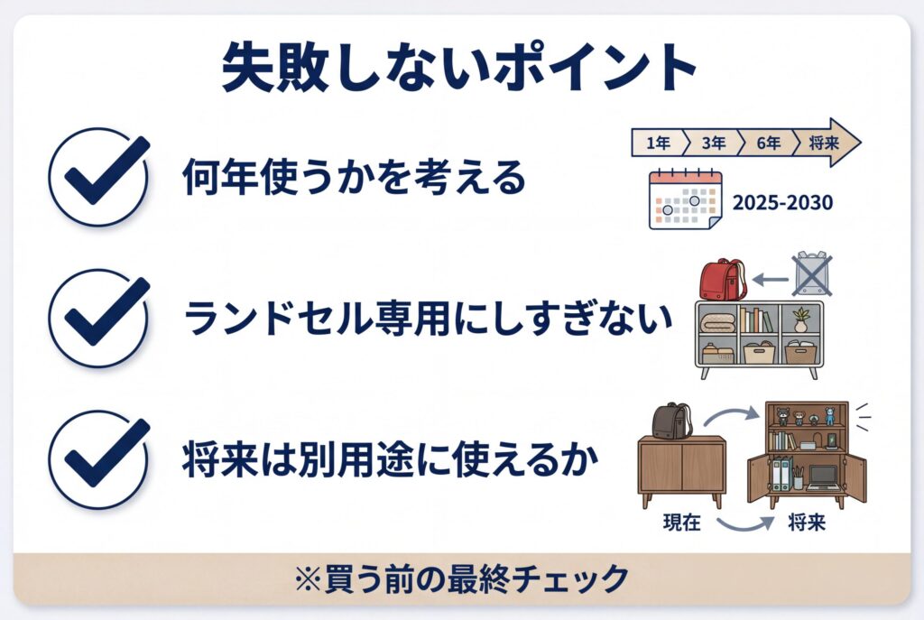 もしランドセルラックを選ぶなら、何年使うか、将来は別の用途に使えるかを意識しましょう。