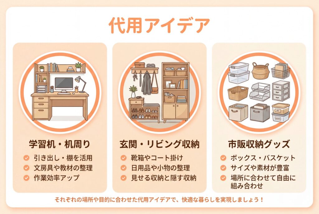 カラーボックスや収納ワゴンなど、市販の収納グッズで代用できることもあります。