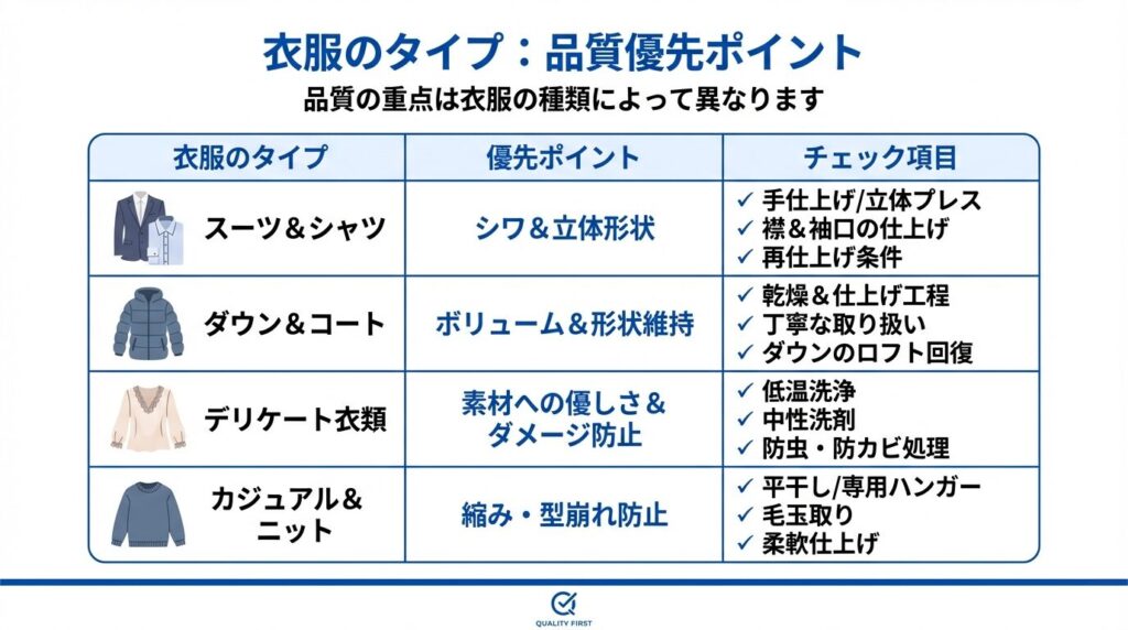 また、スーツはプレス品質、ダウンはボリュームと型崩れ、ブランド服は風合いと色の管理というように、服の種類で優先ポイントを変えるのが賢いやり方です。