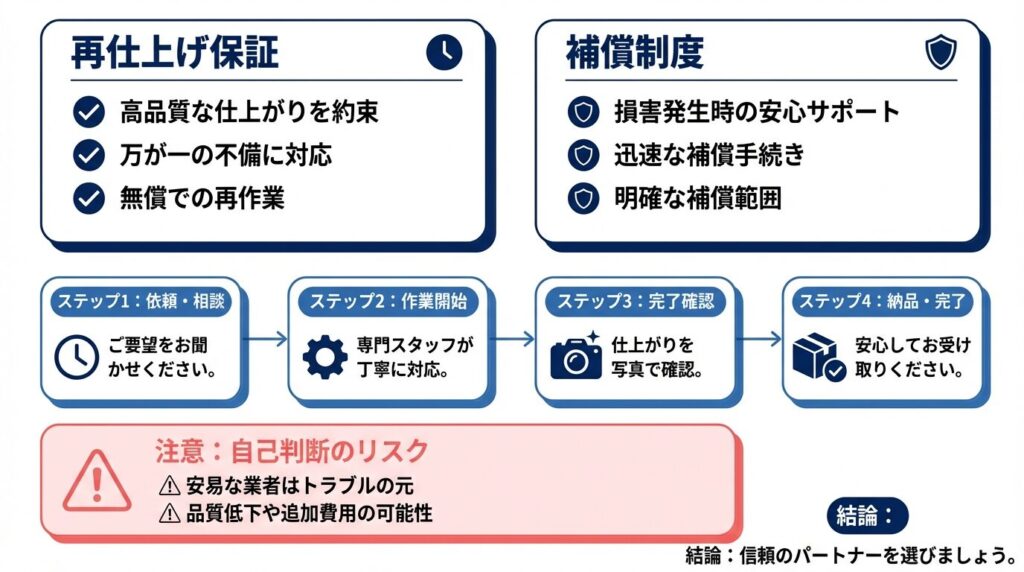 品質重視で最後に背中を押してくれるのが、再仕上げ保証と補償です。