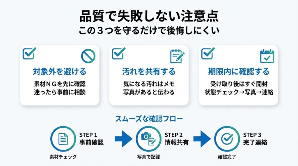 最後に、対象外の確認・汚れのメモや写真共有・到着後すぐの状態チェックまでやれば、品質重視でも後悔しにくい運用ができます。