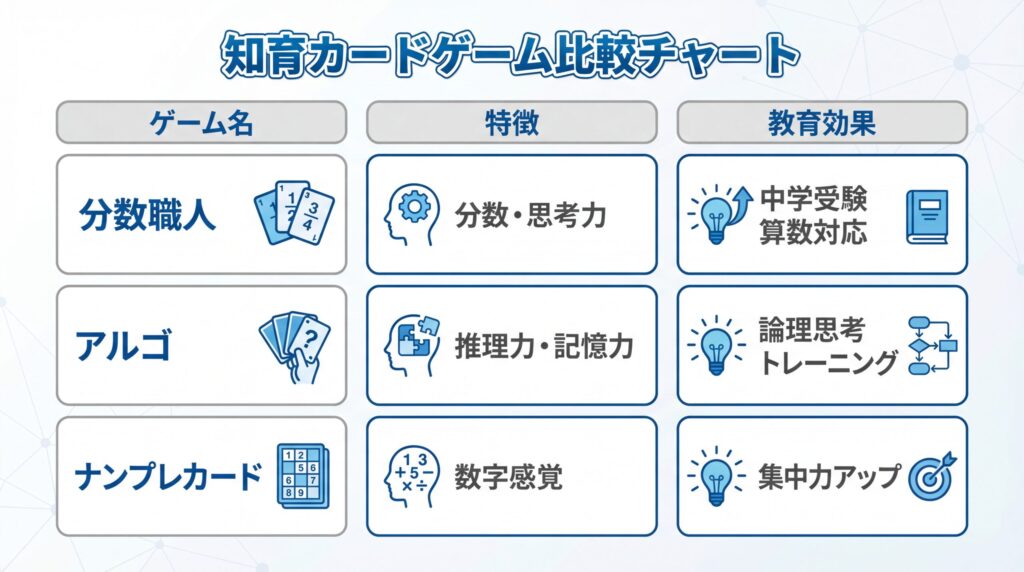 他の算数系知育ゲーム(例:アルゴ、ナンプレカードなど)と比べると、分数職人は「計算+推論」の両方を使う点が大きな特徴です。