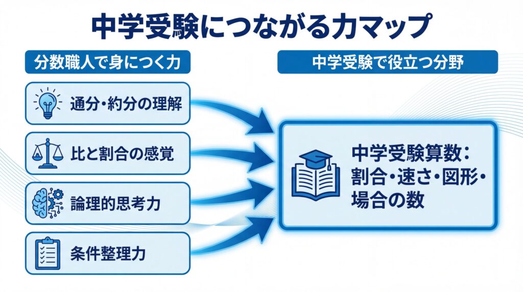 分数職人で鍛えられる力は、そのまま中学受験算数の基礎に直結しています。
