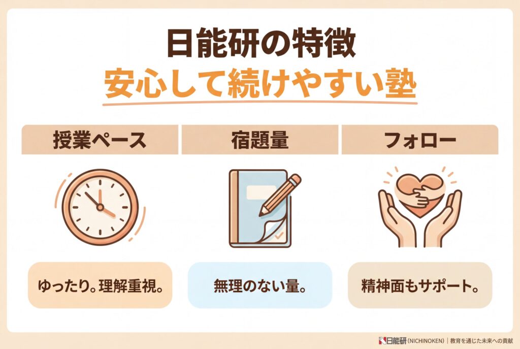 | 日能研 | 定着重視で面倒見が良い | 慎重で安心感を求める子 |