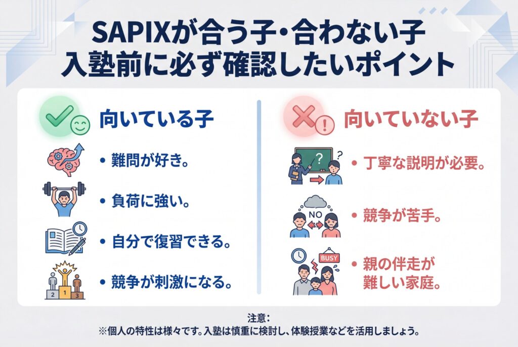 SAPIXは合格実績だけで決めるより、性格と家庭の回し方で判断するのが安全です。