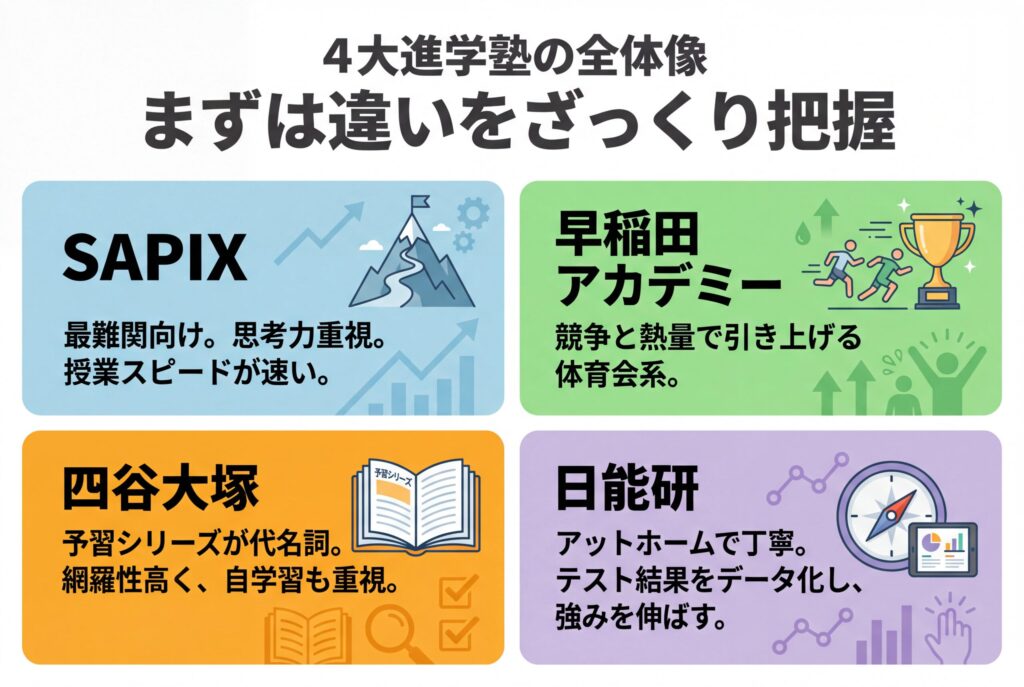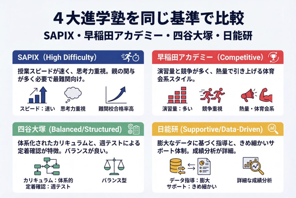 SAPIX・早稲田アカデミー・四谷大塚・日能研の違いを、同じ基準で分かりやすく解説します。